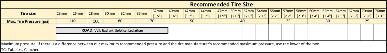 - Max tire pressure for tire widths: 25mm: 120psi, 32mm: 80psi, 40mm: 60psi, 50mm: 45psi
