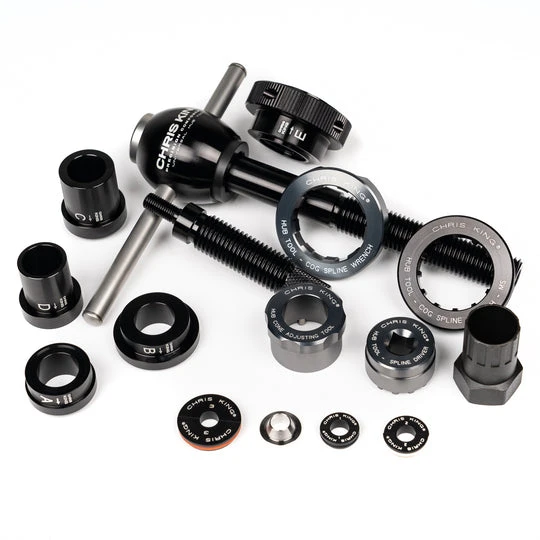 The Chris King Universal Hub Tool is a high quality shop tool designed to completely disassemble and reassemble Chris King R45D, R45, Boost CL, Superboost, ISO, Classic, and BMX hubs. Though not required for basic adjustment or routine hub maintenance, it makes a striking addition to your tool set, allowing professional and home mechanics to perform complete hub overhauls and bearing service. A hub cone adjusting tool and comprehensive technical manual are included in the complete kit.