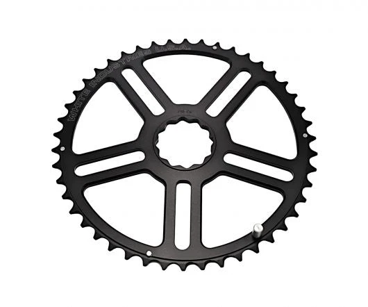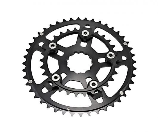 The outer ring is designed with a slotted section and the inner five bolt ring is self centering allowing more options when compared to traditional crank designs with set bolt circle requirements.